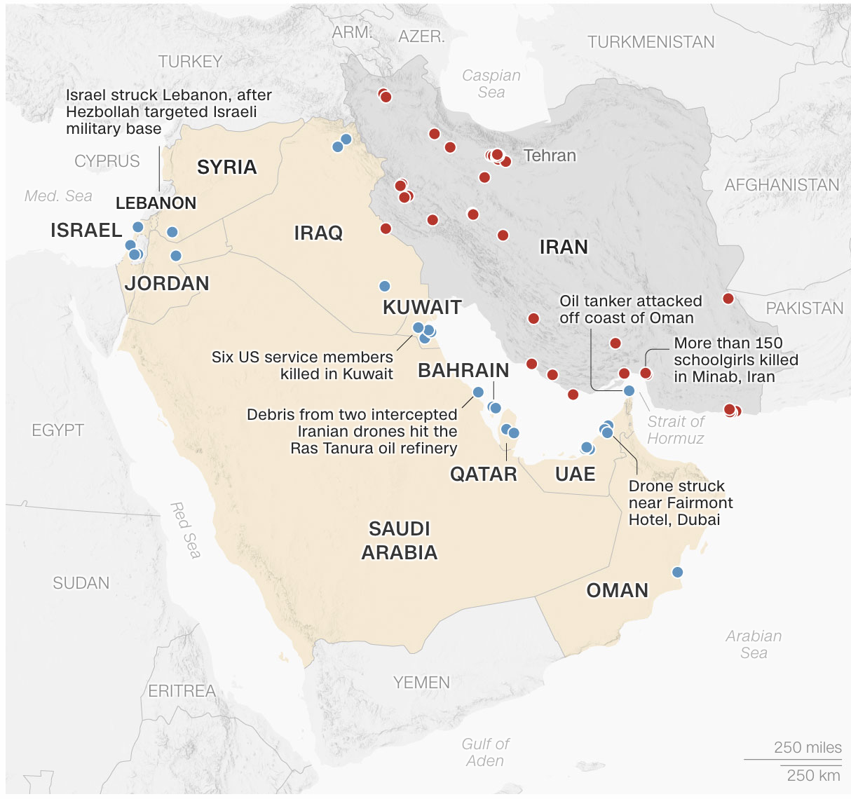 Iran responded with retaliatory missile and drone attacks targeting U.S. and Israeli positions. Eight Arab countries have reported missile attacks: the United Arab Emirates, Bahrain, Kuwait, Saudi Arabia, Iraq, Jordan, Oman, and Qatar. In addition, the Revolutionary Guard also claims attacks on US and UK oil tankers, and the destruction of some US cruisers and destroyers.