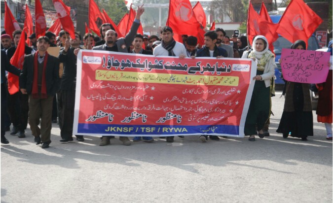 Saturday,February 13, 2016 – the Rally of Revolutionary youth and workers alliance (RYWA) and JKNSF marched from Murree road to Rawalpindi Press club, in which hundred of workers and students activists participated from Pakistan and Kashmir.