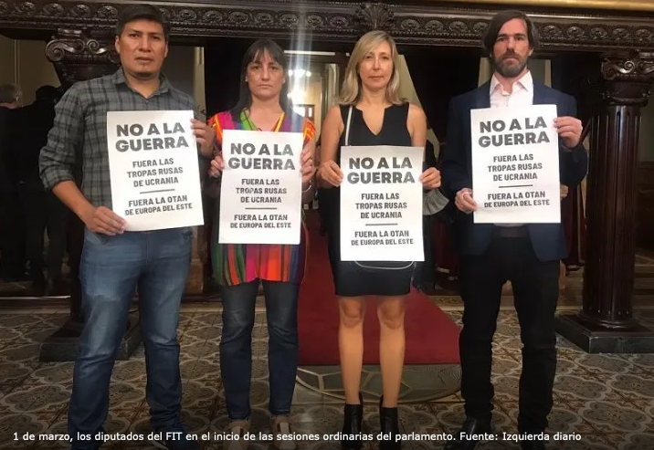 The second “No to war” sector is expressed by organizations that claim to be Leninist and Trotskyist. This is the case of organizations that make up the Left and Workers Front – Unity (FIT-U) of Argentina. Recently, national deputies Nicolás del Caño, Myriam Bregman and Alejandro Vilca, of the Partido de los Trabajadores Socialistas (PTS), and Romina del Plá, of the Partido Obrero (PO) published a photo taken in the Argentine Congress holding signs with this slogan (see article photo). These organizations defend this proposal in statements and articles published on their web pages [4]. It is with this position that we want to debate, because we consider it wrong.