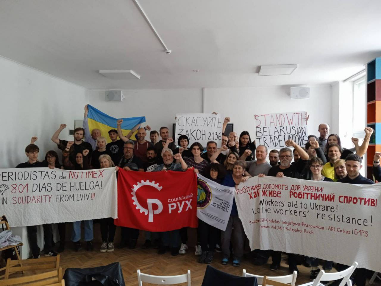 This delegation was received by around 40 Ukrainian activists, including trade unionists from the Kryvyi Rih Miners and Metalworkers Union, Lviv Construction Workers and Railway Workers, the women’s organization Feminist Workshop, the refugee rights organization Work Safe, in addition to the left-wing organization Sotsyalnyi Rukh who organized the event. (II)