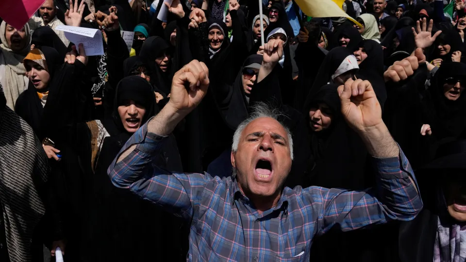 People chant slogans during a protest to condemn Israeli attacks on multiple cities across Iran, after the Friday prayers ceremony in Tehran, Iran, Friday, June 20, 2025. (AP Photo/Vahid Salemi)