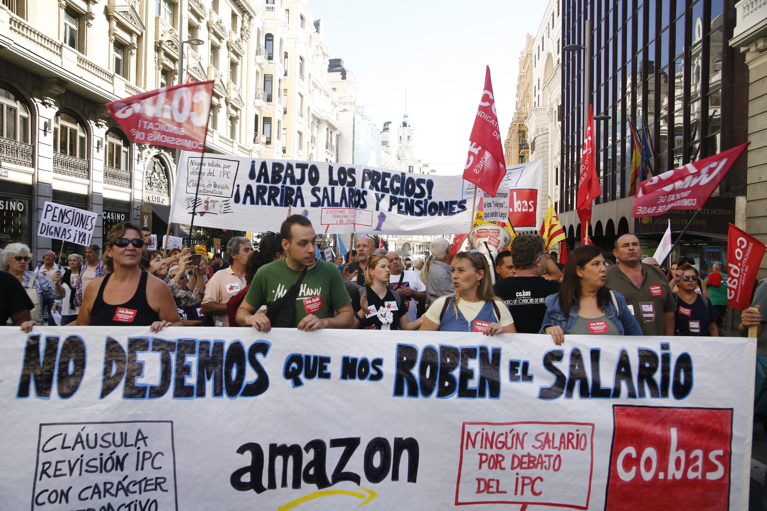 El sindicato de Comisiones de Base (Co.Bas), junto a l@s compañer@s de la Sección Sindical de Amazon, se agruparon en torno al Bloque Combativo y de Clase que en su cabecera portaba una pancarta cuyo lema decía: “Ningún salario y pensión por debajo del IPC real. No a los planes privados de empresa”.