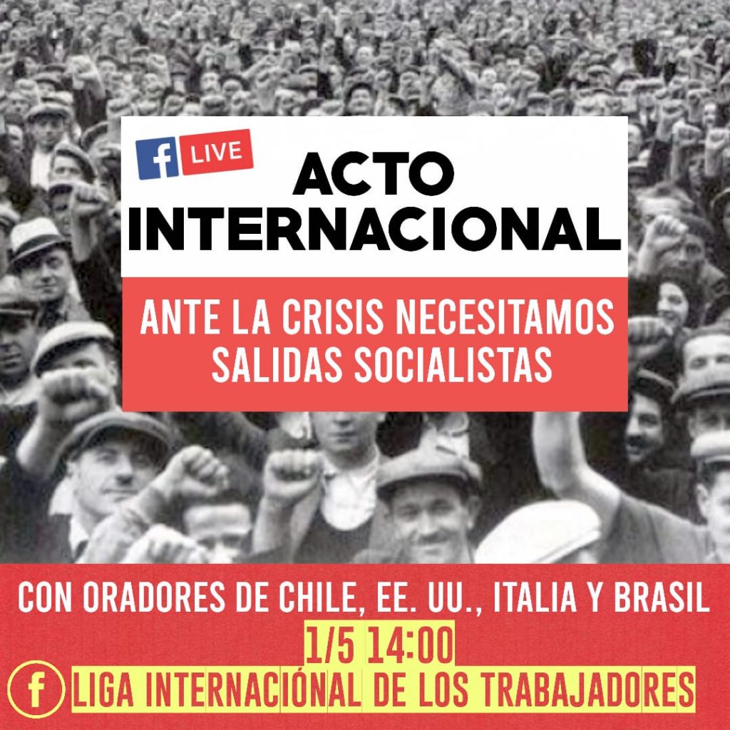 Neste 1º de maio aproveitaremos as circunstâncias do isolamento para fazer um ato internacional, de maneira virtual. Com companheiros do Chile, Brasil, Itália e Estados Unidos, faremos uma comemoração da tradição dos trabalhadores. Mas também debateremos qual é a saída para esta crise e como podemos construí-la. Fazemos um convite especial para trabalhadores, mulheres, jovens, estudantes, desempregados, aposentados, a se unirem a essa transmissão na sexta-feira 1º às 14:00 pelo Facebook da LIT-QI e a participar com suas contribuições.
