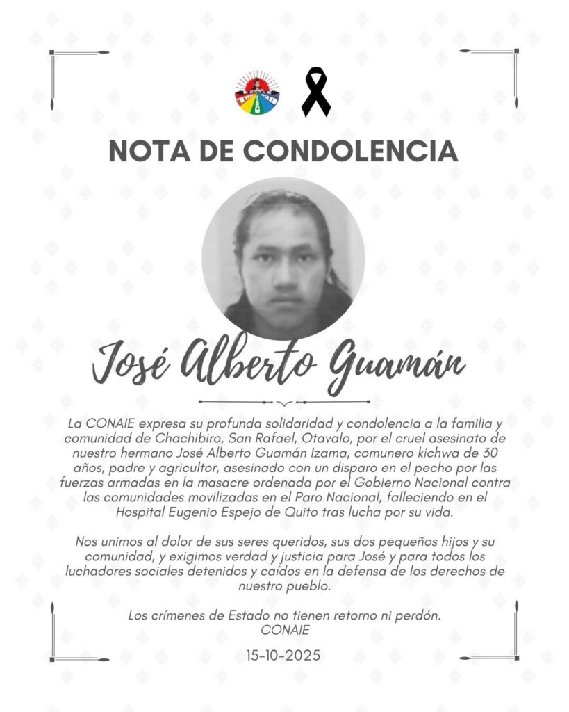 PS:  Hoje dia 15, acaba de ser confirmada a morte do  José Alberto Guamã, de 30 anos, agricultor assassinado pelos militares, a mando do goberno Noboa, com um disparo de bala no peito.