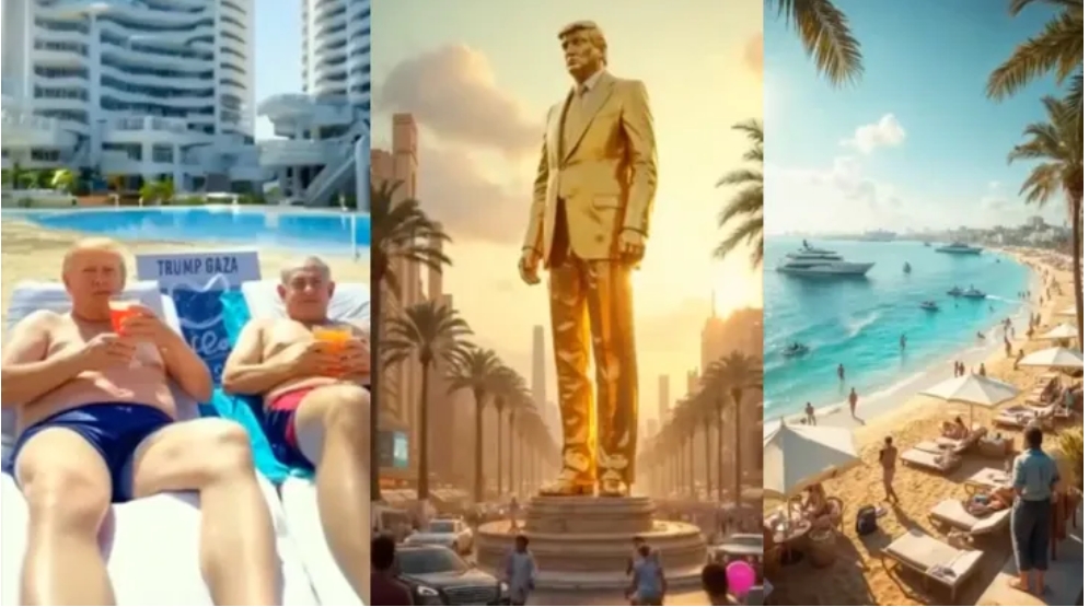 A cena futura, com o plano de Trump, é retratada em “Praia de Gaza 2030”, do cartunista Peter de Wit, em que um casal toma sol em praia paradisíaca enquanto o filho pequeno alegremente desenterra crânios na areia. A obra foi agraciada em 2025 com o prêmio anual de melhor charge política na Holanda.